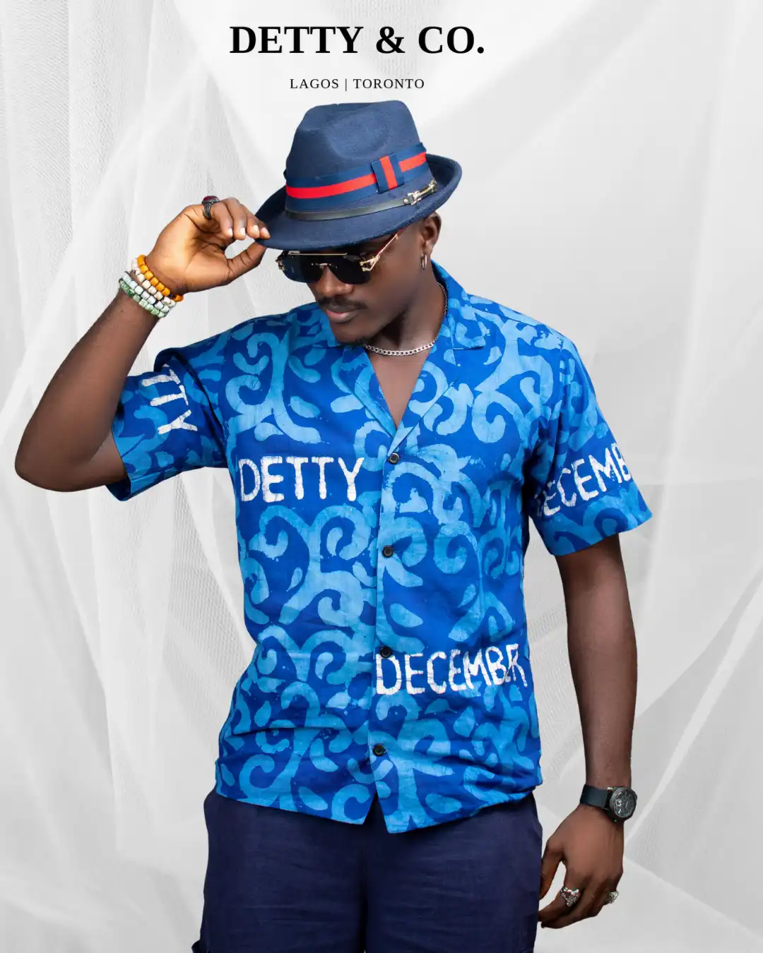 Featuring a striking blue Adire-inspired swirl pattern and bold white “Detty December” script, this relaxed-fit men’s shirt captures the fearless, celebratory energy of the season. Lightweight and breathable, it’s designed to move with you — from Lagos rooftops to beachside getaways. To Wherever the season takes you, this shirt carries the vibes of the Detty December all year long.